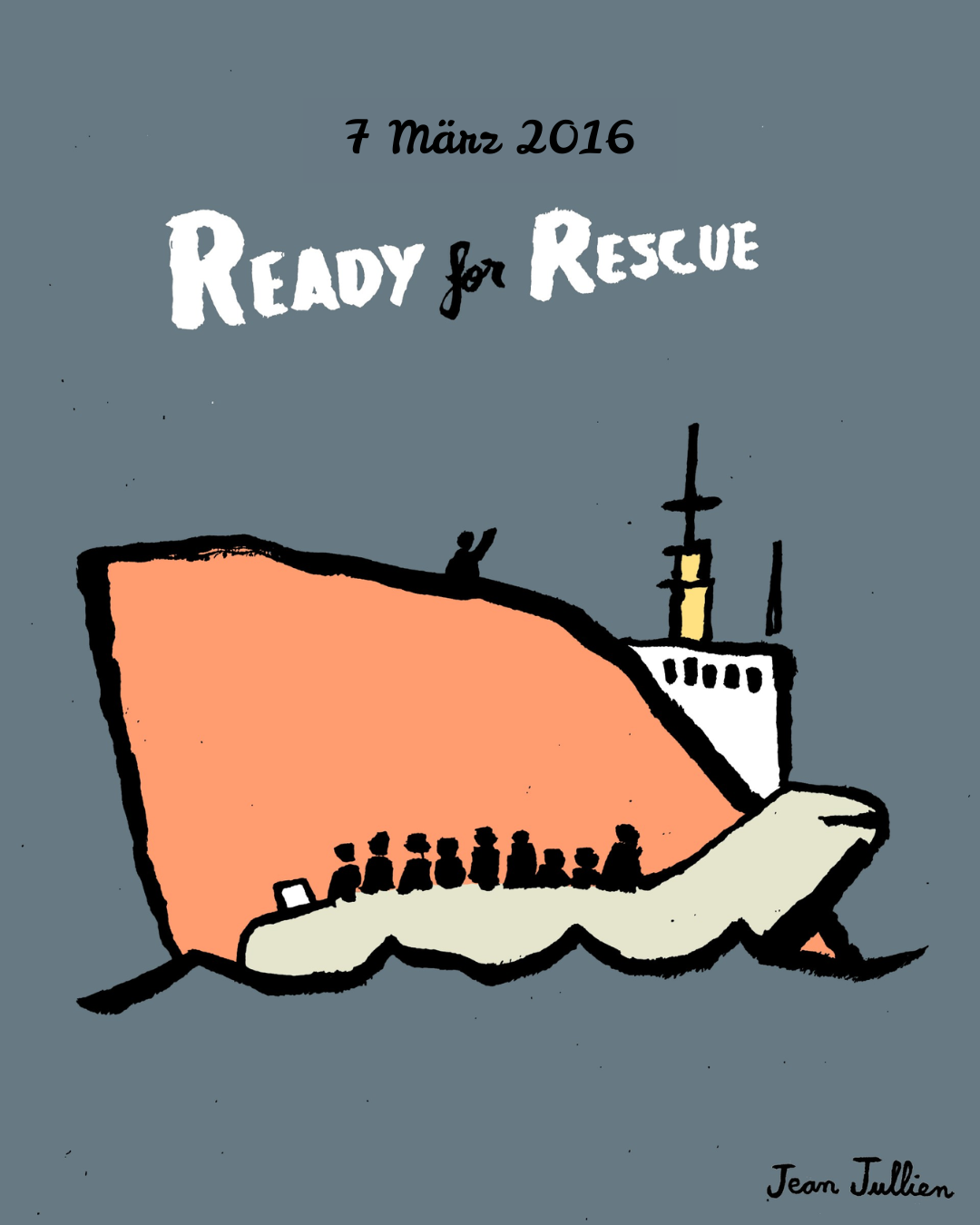 Im Laufe des Jahres werden uns verschiedenste Künstler:innen dabei unterstützen, die prägenden Momente dieses Jahrzehnts auf See bildlich darzustellen. Diese erste Illustration stammt vom französischen Zeichner Jean Jullien.